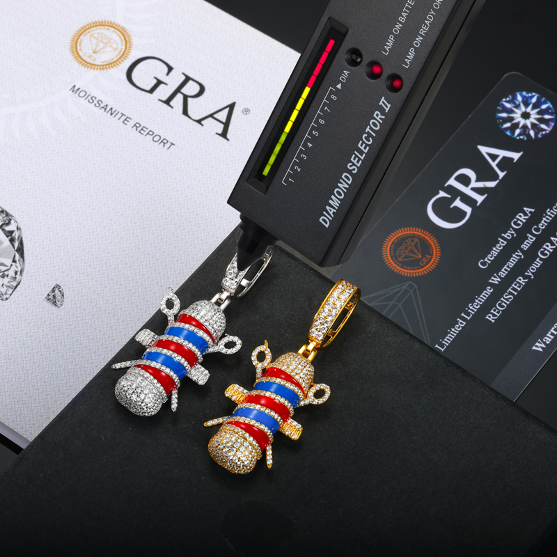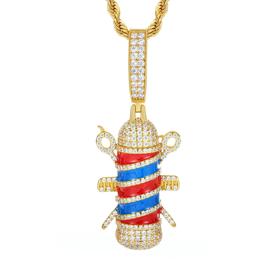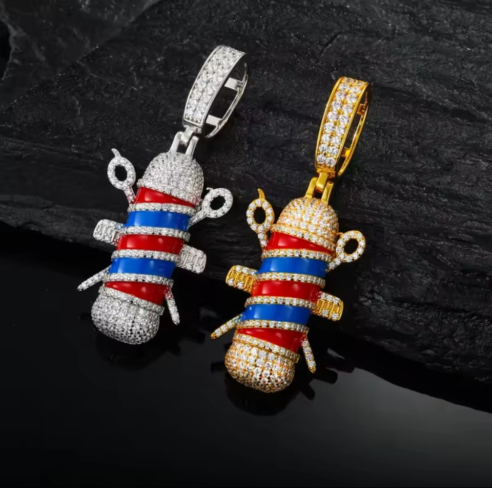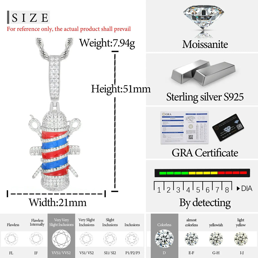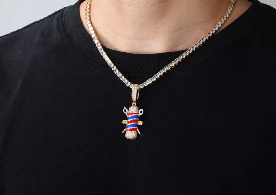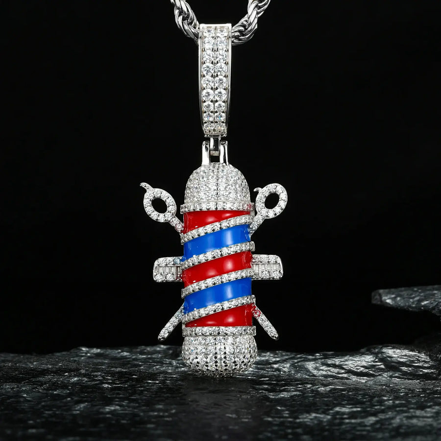 A Icy Barber Pole Pendant made of real 925 Sterling Silver, and covered with high quality moissanite diamonds that passes the diamond tester. A stylish crafted barber pendant to accommodate your attire.