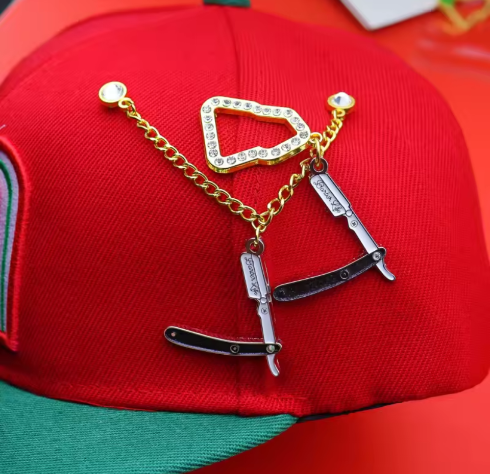 Style your cap with a cool barber razor pin.