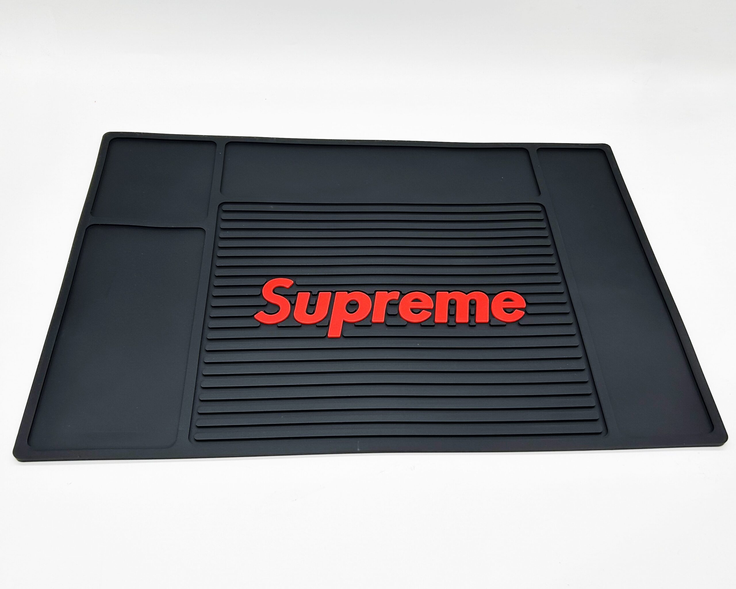 The Supreme Mat is a anti slip atmosphere for your hair tools and hair clippers. Equipped with four slots to inserts your hair combs, clipper guards, razors, and anything you want to place insight.