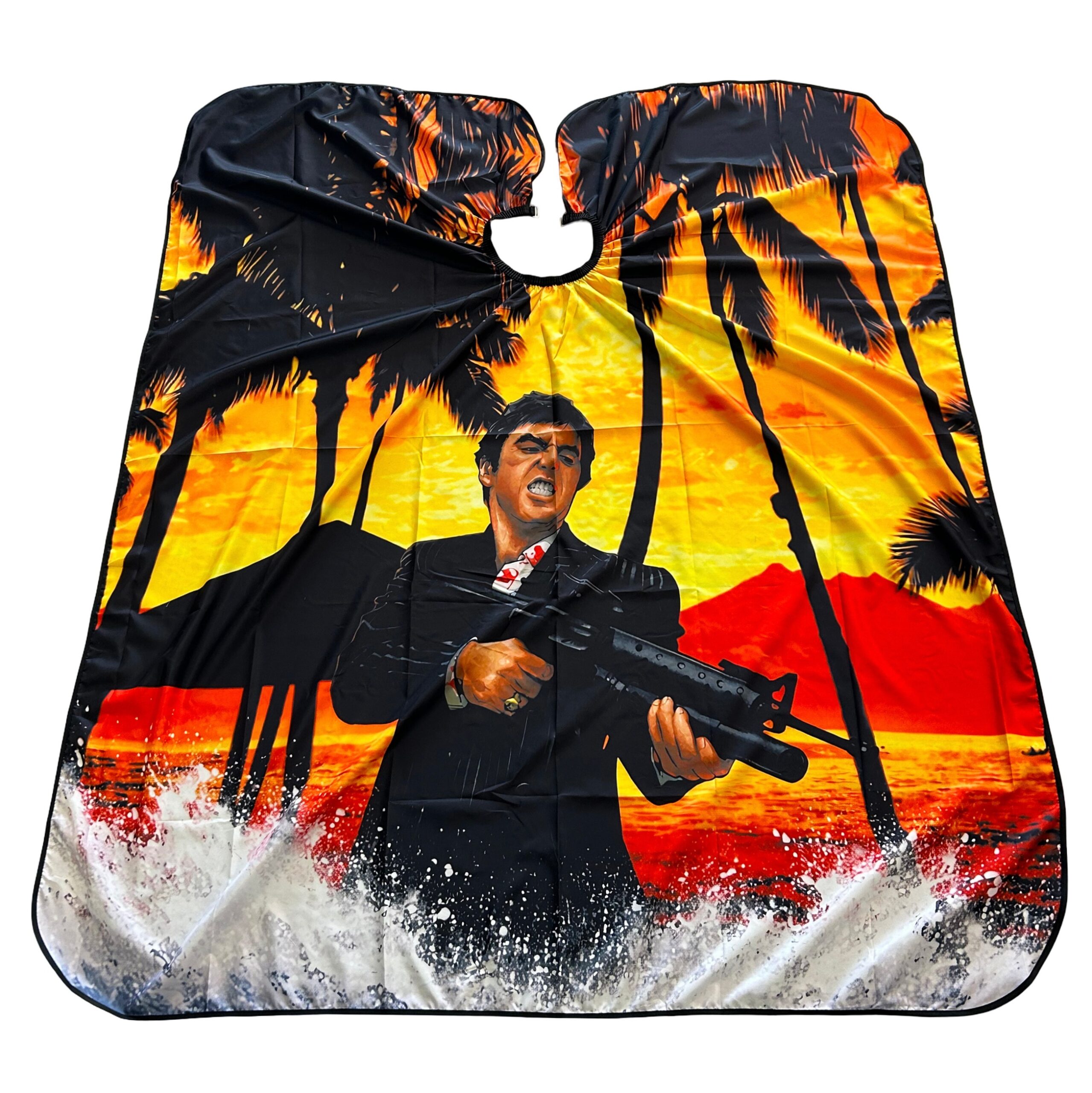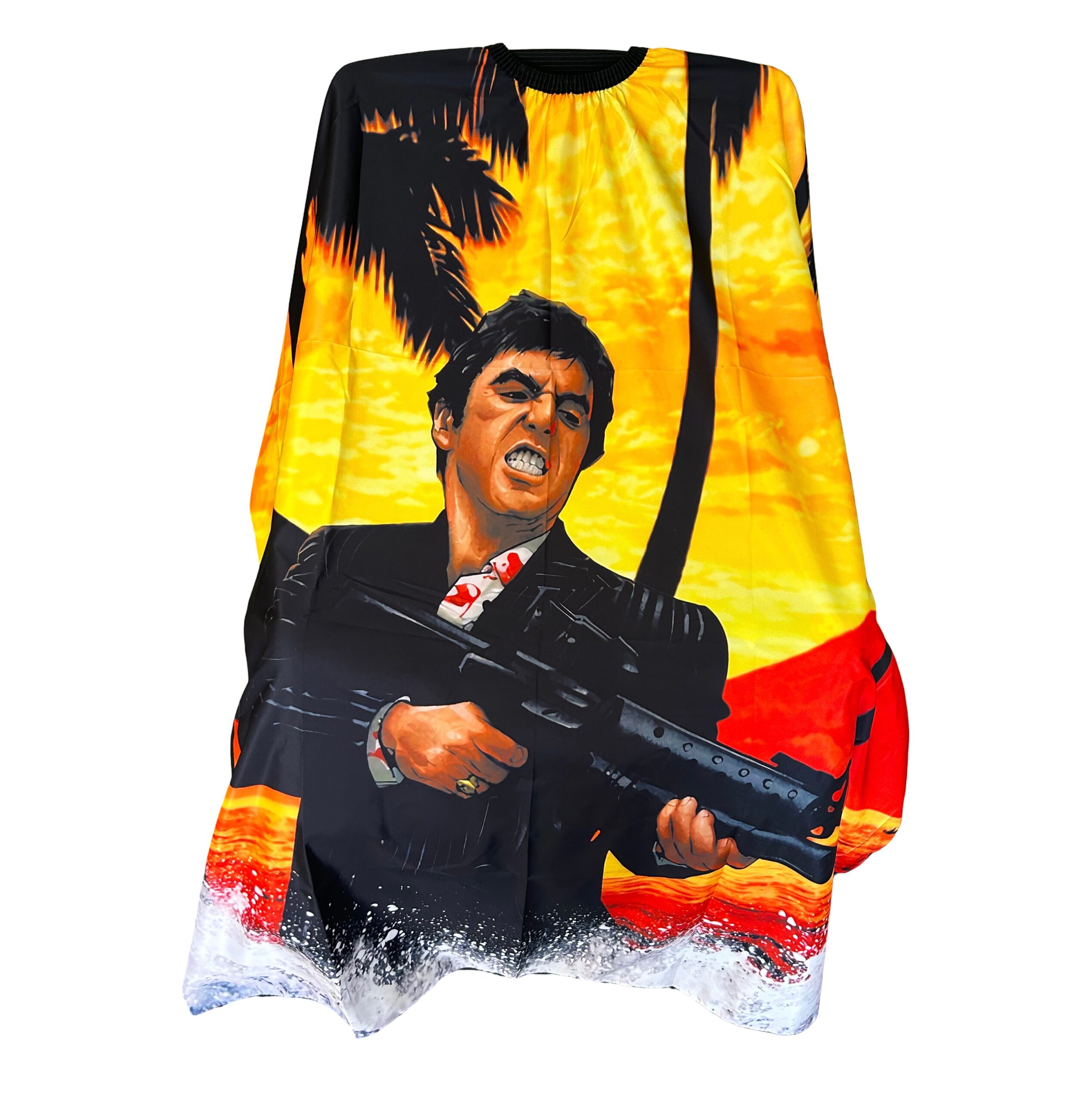 A one of a kind Scarface barber cape with a XL neck length that can fit any size neck. Made of polyester fabric that is lightweight, durable, and water resistant to keep your customers comfortable, and cool through out the whole haircut.