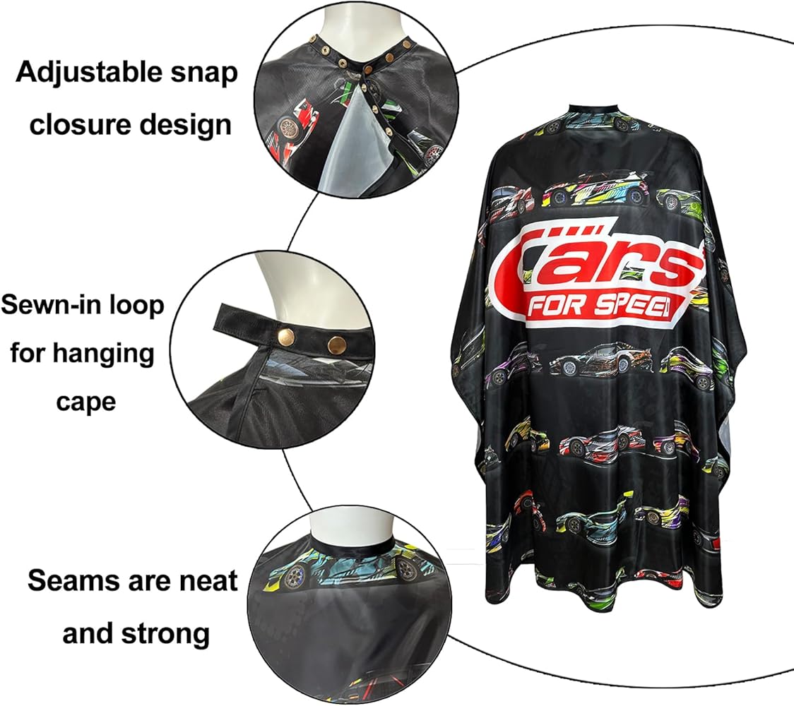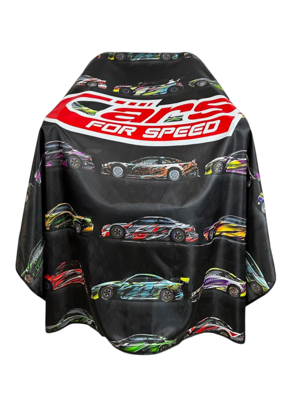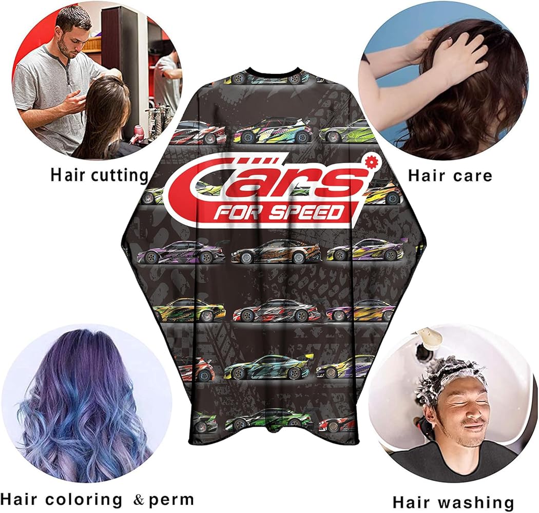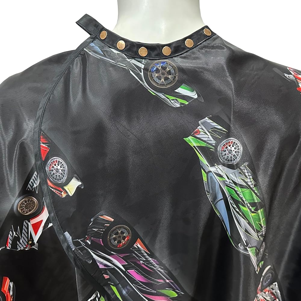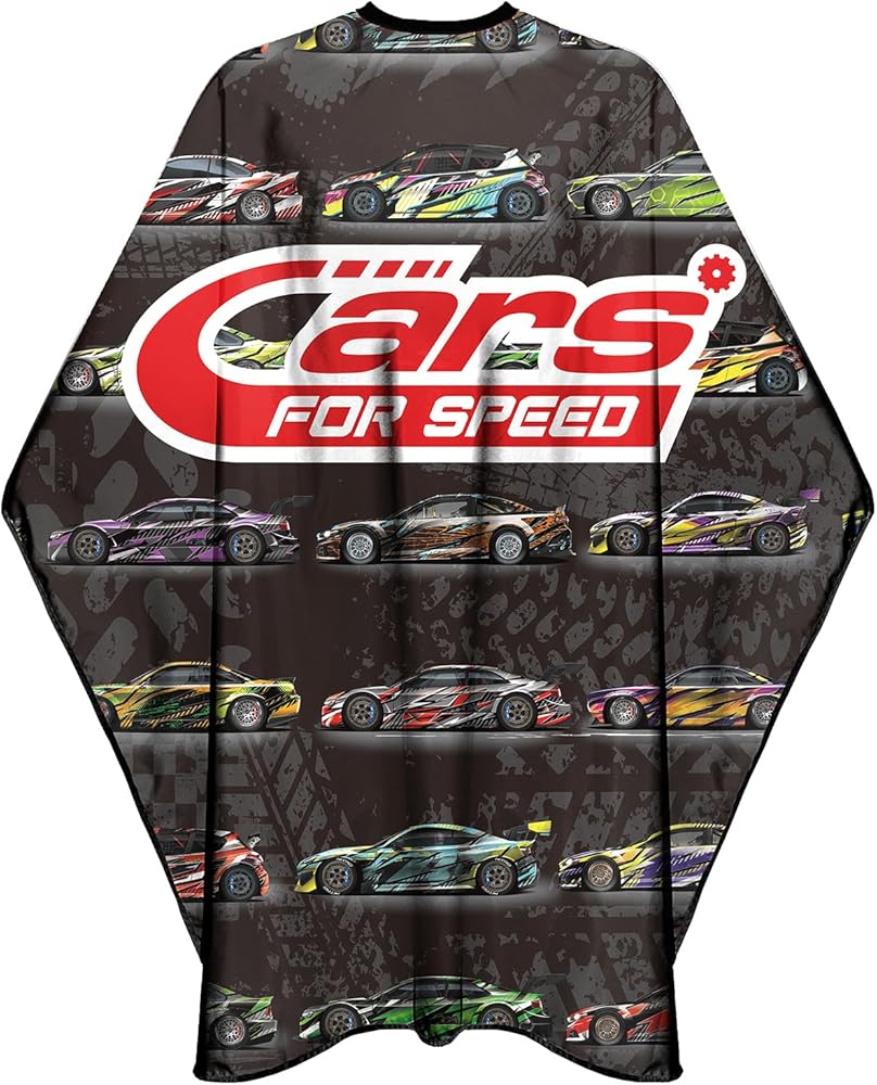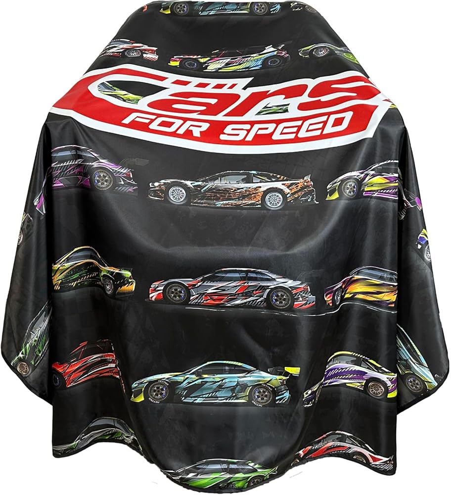 A cool speed cars barber cape to add to your collection.